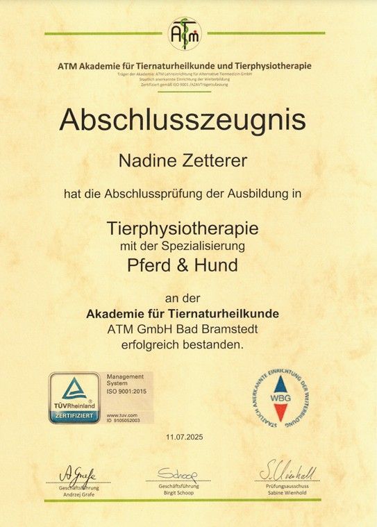 - Juli 2025: Zertifizierte Tierphysiotherapeutin Pferd/Hund (ATM)